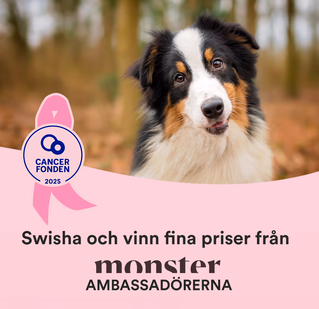 Vi stödjer Cancerfondens Rosan Bandet Kampanj som syftar till att samla in pengar till livsviktig cancerforskning. Tack vare forskningen har vi sett stora framsteg - idag överlever nära 9 av 10 personer som får en bröstcancerdiagnos. Men vi är inte färdiga än! Under hela oktober kommer vi på Monster att bidra till kampen mot cancer genom att skänka pengar. Hos Monster finns en drivkraft och övertygelse om att vilja göra skillnad för såväl fyrbenta som tvåbenta familjemedlemmar.